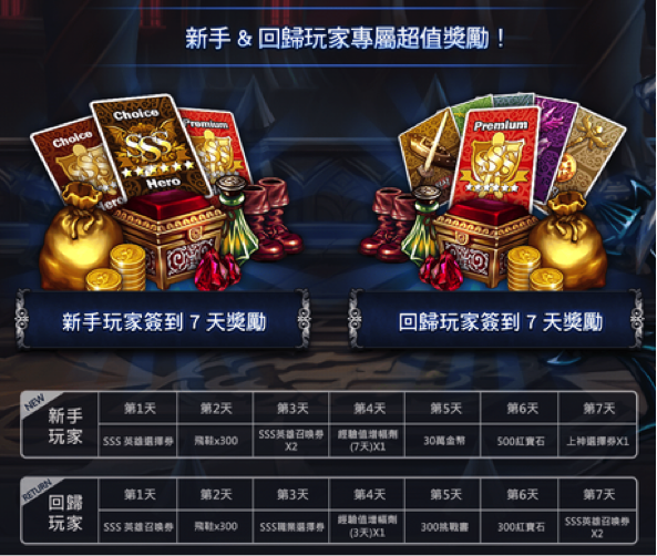 為了歡迎新玩家的加入,以及回歸舊玩家的歡迎,官方還特別設計了7天簽到獎勵,新玩家能夠在第7天的時候,獲得5大上神的SSS級英雄選擇券!每天登入都有超值獎勵,讓新朋友玩得開心!