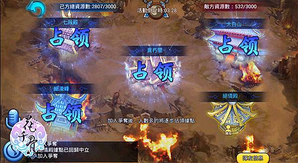 延續《花千骨》眾多戰鬥玩法,這次再度隆重推出跨服12V12多人佔地搶資源玩法,玩家可以選擇單槍匹馬英勇上陣,更可支持最多3人組隊參加。對戰過程中,雙方透過戰鬥來攻佔據點,進而獲得資源點數,最先拿到3000資源點數的團隊便可獲得勝利!每天獲得首勝的玩家,還可領取額外獲勝獎勵。