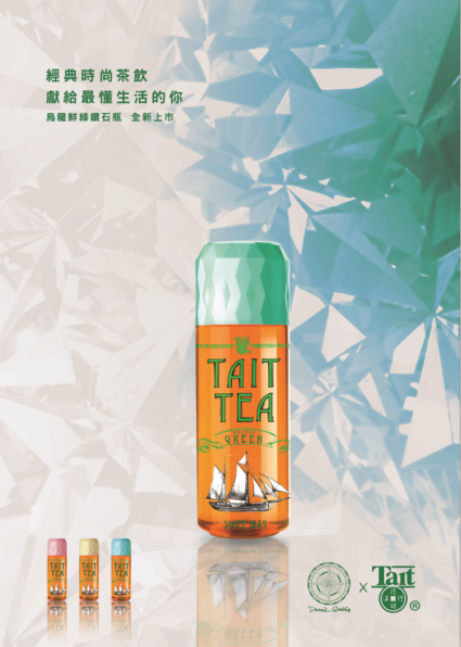 除原先烏龍茶外,為了給消費者更多元口味,將於八月十五日推出的TAIT TEA德記洋行烏龍鮮綠茶,此產品結合台灣包種烏龍茶與綠茶,同時展現綠茶的清新與烏龍的多層次香醇底蘊。受豐富層次口感啟發,以精品鑽石概念融入杯蓋之中,將杯蓋設計成鑽石切割型茶杯,提昇層次感的同時,讓瓶蓋既時尚又顯現價值感,並搭配Daniel Wong全新經典的帆船標籤,將給予消費者全新的味覺與視覺享受。