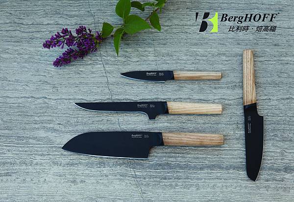 簡潔俐落的造型,採用鉻-鉬-釩等元素,增強刀體鋼性,具備耐酸鹼、抗侵蝕的特性,刀刃採用無光澤鈦塗層設計,兩種手把設計空心/白楊木握把有效隔熱並方便拿取。榮獲德國紅點設計獎中最高殊榮「最佳紅點獎」(The Best of the Best Award)的肯定。