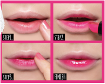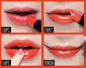 漸層水吻唇 順著上下唇型輕抹雙層唇膏完整上色後,輕抿上下唇, 呈現不刻意修飾的色彩漸層感。使用外圍果凍保濕唇膏再次輕抹上, 展現時尚水吻唇!