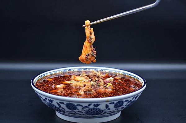 劉大師選用黃牛腱肉,以慢火燒軟後切片,底料則是這道料理的美味精華,加入花椒、辣椒、八角、香葉、甘草與牛肉高湯,慢火細熬五小時使其滾燙油沸,逼出濃郁辣麻香氣。主廚推薦這道料理的原因在於饕客們享用這道菜的同時,不僅能嚐到燉到軟爛的牛肉香,厚切粗獷的肉片涮上麻辣滾燙香辣湯頭,緊緊包覆著川香精華,讓人一吃上癮,佐酒下飯首選!