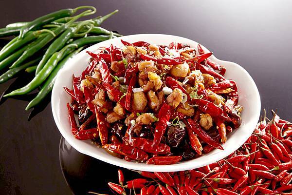 師父選用每隻約1.5斤的幼雞,以乾辣椒、薑、蒜、花椒、生抽、老抽增香調味。先將薑蒜切片備用,雞肉切小丁瀝乾,入熱鍋大火快炒,接續加入薑、蒜爆香,並加入少許生抽調味,撒入3茶匙的花椒粒炒香,最後加入大量乾辣椒煸炒,上桌前瀝乾雞肉上的餘油,為重慶一地的老菜代表,極具江湖豪邁風格,大盤出菜,不假裝飾,光是辣椒就佔了整盤份量的一半以上,當地人稱「在辣椒裡找雞吃」。劉師父表示:最好吃的辣子雞不是炸也不是炒,而是要用煸炒的手法料理而成。