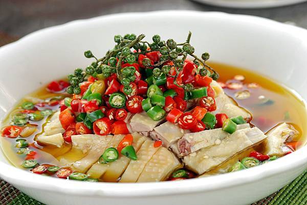 此道料理為廣式傳統料理之一,美味重點在於熬製的醬香氣味與雞油脂香完美結合,劉大師此行來台選用肉質彈嫩的土雞肉,將其剁塊水煮後備用,醬汁則使用雞高湯、醬油與青花椒入鍋熬煮15分鐘,佐以雞肉享用,肉香醬味交織,完美營造淋醬鹹鮮、清香、濃郁的川式風味。