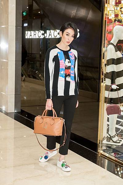 日前代表品牌出席Patchmarc活動的個性名模-劉欣瑜,身穿俏皮的條紋米奇上衣與黑色窄管褲,搭配焦糖色的托特包款,不論是隨意的手提或是率性的斜揹都展現出魅力時髦的穿衣風範。