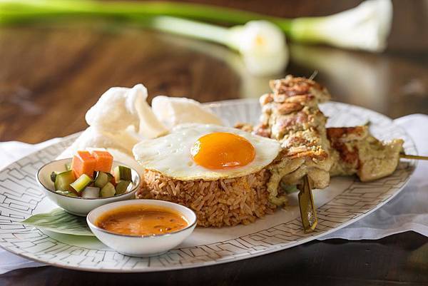 - 印尼炒飯搭配太陽蛋、蝦餅與雞肉沙嗲 TWD570