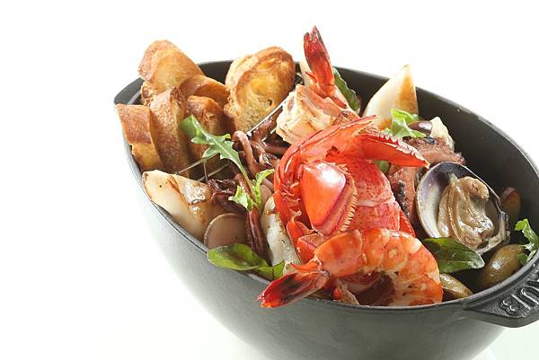 嚴選波士頓龍蝦、北海道干貝、淡菜、明蝦、花枝、蛤蜊等豐美海鮮,將其香煎後備用。接著製作番茄海鮮醬汁,熱鍋放入紅椒、洋蔥、蒜苗和蒜頭拌炒至軟爛,再放入新鮮番茄、番茄醬汁和海鮮高湯共同熬煮1.5小時,濃縮而成。呈盤時以馬鈴薯塊及黑橄欖襯底,再鋪上鮮美甘甜的海鮮,最後淋上番茄海鮮醬汁即成。