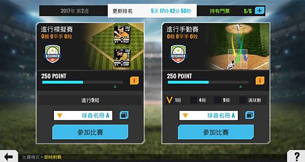 為了回饋球迷玩家的支持,《棒球殿堂2017》將比賽模式全面提升,共提供「即時對戰」、「LIVE賽季」、「HOMERUN RACE」和「一局勝負」模式。玩家們可在「即時對戰」模式中,透過隨機配對或邀請好友進行即時連線對戰,除了正規9局賽外,也可選擇短局數或滿球數進行比賽,緊張、刺激的氣氛如同真實的棒球比賽。