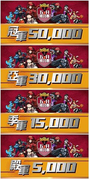 冠軍獎品:獎金50,000 新台幣,全隊均獲得MVP金色套裝(30天)