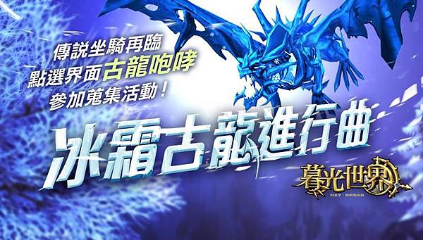 自身擁有技能的傳說坐騎「 冰霜古龍 」,沉寂百年後甦醒的牠,夾帶著無與倫比的恐怖力量,想要擁有牠?就趁現在!冰霜古龍進行曲慶典再開,快去「古龍咆哮」參與慶典,透過完成副本關卡、蒐集材料來獲得超狂霸氣的「 冰霜古龍 」傳說坐騎!