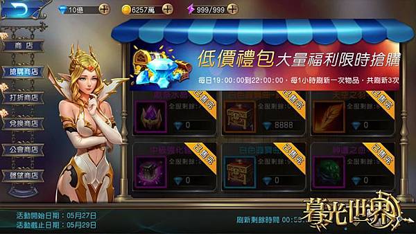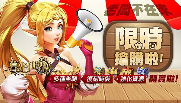 端午佳節連老闆也放假去!趁老闆不在,《暮光世界》趕緊來場限時搶購大拍賣,多樣珍稀好禮現身,例如白色情人節限定時裝 ─ 浪漫圓舞曲系列、機械暴龍、大量賢者之石、獻祭水晶、星魂石…等各式培養資源,通通大拍賣,手指速度慢一點,可就搶不到了!