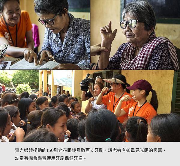更遠至柬埔寨義診服務合力將募得的上萬公斤白米、數百公斤的中、西藥品、文具、衣物、及上千份牙刷老花眼鏡等,