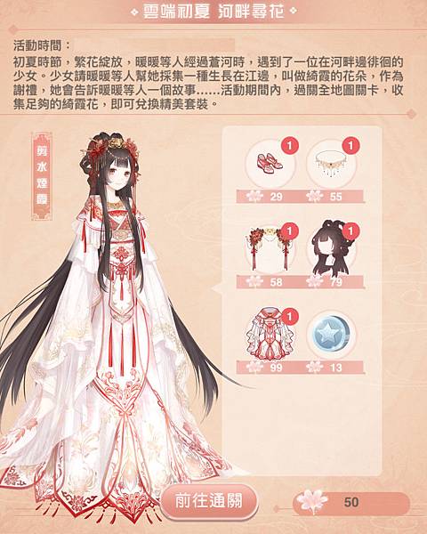 蒐集一定數量的綺霞花將能兌換「剪水煙霞」套裝。