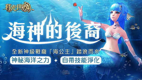 有著蔚藍色的眼珠,彷如最深的湖水,皮膚又光又嫩,下半身是披著麟片的漂亮魚尾,她就是「海公主」!作為大海之神的掌上明珠,天生擁有強大的能力,無憂無慮的海中生活,塑造了海公主與世無爭的單純性格。然而,暮光大陸的各種陰謀動盪,影響了海洋的和平,為了守護自己珍視的家園,她決定離開深海,成為冒險者身邊最可靠的夥伴!海公主的自動與手動技能可以解除冒險者被控制的效果,並且在接下來一段時間內,還能免疫控制技能,同時回復冒險者的血量。她的技能就如同她的個性,是如此溫柔的幫助冒險者們!