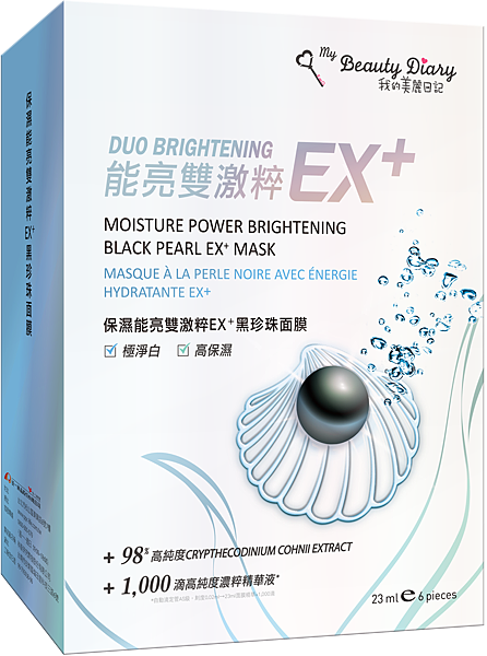 我的美麗日記「保濕能亮雙激粹EX+黑珍珠面膜」, 添加珍稀的法國大溪地黑珍珠明星成分,展現淨、透、亮、白無瑕細緻的光滑美肌。同時添加98%高純度隱甲藻萃取,獨特的隱甲藻擁有堅韌的生命力,提供肌膚源源不絕的保濕活力。