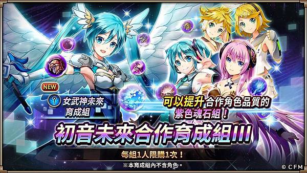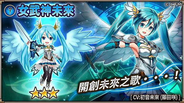 活動限定的角色「女武神未來」以及她的專用裝備「真・女武神未來的寶劍」新登場。「女武神未來」是將「初音未來」與「神域召喚」的世界觀結合而設計的角色。角色的固有技能可以回復數名友方的HP。另外,專用裝備「真·女武神未來的寶劍」是可以回復該裝備角色自身HP的強力裝備。並且「女武神未來」在限定活動組隊戰鬥「小初音未來降臨」中能力值大幅度提升。獲得該角色以及裝備讓組隊戰鬥活動進行的更順利!