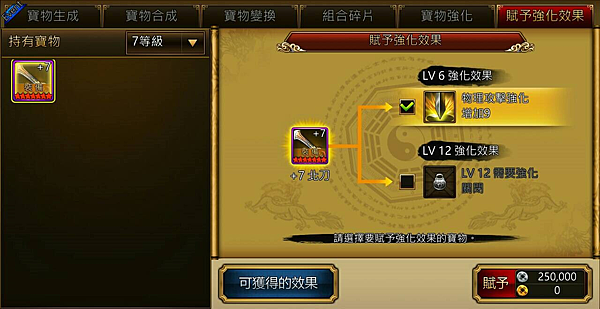 同時,1至7等級的所有戰略寶物,皆可透過「寶物強化」系統進行強化,強化等級共分為12階級,當強化階段在LV6及LV12時,系統將會開啟強化效果。