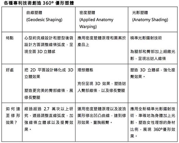 從視覺科學衍生出來的主要技術為曲線塑體 (Geodesic Shaping)、密度塑體 (Applied Anatomy Warping)、以及光影塑體 (Anatomy Shading) 技術。結合以上各種技術和設計,BODY OPTIX™優形丹寧系列當中的每一件牛仔服飾都應用了多重塑身設計,務求在不同角度之下,都能夠提升修形效果,同時塑造3D立體輪廓、理想體態、性感翹臀以及修長雙腿。