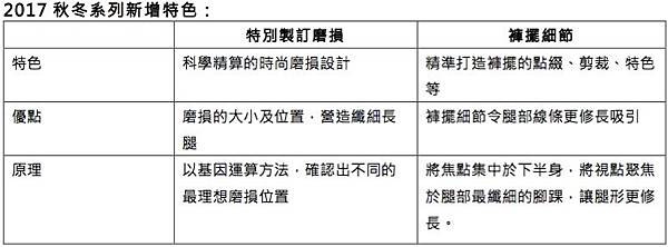 BODY OPTIX™特有的立體剪裁技術,將身體的比例拉長,引入高腰線的連身裙、9分喇叭褲、rider dress及紐紋車線牛仔褲等,比起單純貼身褲,更散發出優雅女性魅力。