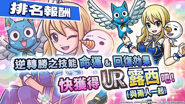 完成合作活動限定任務關卡「妖精尾巴之戰」、「黒魔導士瑟雷夫」、「大魔鬥演舞」即可獲得名聲。累積名聲進到上位排名將可獲得可進化至UR「[兩人一起]露西」的SSR「[星靈公主]露西」。解放她的潛在能力將可以讓她獲得有回復Unison量表跟Cost的技能喔。