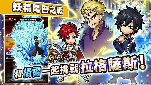 與「格雷」一起挑戰「拉格薩斯」的限定任務「妖精尾巴之戰」登場。在此任務中,「格雷」將與你一起奮戰。Unison Attack的時候,「格雷」將會有特別演出喔。