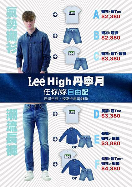 Lee於即日起至4月8日將在全省百貨專櫃首度推出《Lee High丹寧日,任你/妳自由配》活動。主商品包含男女款牛仔襯衫與牛仔長褲,消費者可以喜好選擇不同的套餐搭配,套餐包含(1)襯衫+短Tee、(2)襯衫+短褲、(3)襯衫+短Tee+短褲、(4)牛仔長褲+短Tee、(5)牛仔長褲+襯衫/短褲與 (6)牛仔長褲+短Tee+襯衫/短褲,以上六種不同超值組合,5折優惠價格,幾乎等於買一送一,限時優惠組合$2,380起,各類商品也有眾多潮流單品供挑選,不怕挑不到。另外,憑學生證與校友卡再享95折優惠!想要尋找能兼顧潮流、機能與舒適的丹寧單品,千萬別錯過! 追蹤Lee Jeans Taiwan粉絲團並依指示在貼文留言,有機會可得到自由配組合商品一組(https://goo.gl/pQ4yQt)。