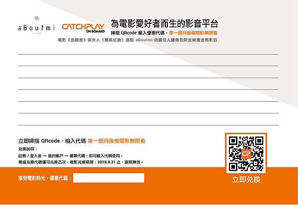 即日起至八月三十一日止,無論在aBoutmi官方網站(www.aboutmi.net ) 或實體通路上購買任一包款,皆可獲得血觀音活動限量明信片,並使用上面所提供的登錄序號獲得CATCHPLAY影音平台一個月的免費觀賞機會。(更多詳情請洽aBoutmi 粉絲專頁上的活動說明)