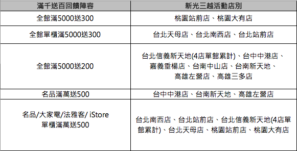 .滿NT$ 6,000 贈新光三越電子商品禮券100元