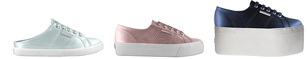 (左起)Superga緞面穆勒鞋-灰銀(售價:2,380元)、2730緞面3公分微厚底鞋-乾燥玫瑰(售價:2,780元)、2802緞面7公分超高厚底鞋-海軍藍(售價:3,480元)