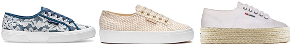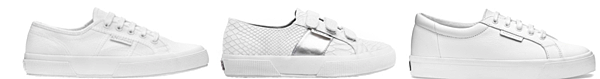(左起)Superga極簡全白款2750(售價:1,880元)、時尚蛇紋款2750(售價:2,380元)、真皮款2750-極簡全白(售價:3,480元)