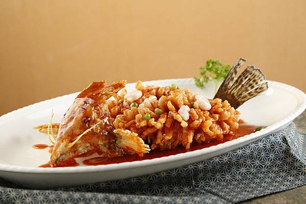 挑戰刀工的該道料理,丁主廚憑借精湛熟練的技巧首將魚貼骨切開,直剞、斜刀片魚肉,切至魚皮時轉為菱形刀紋,深及皮肉的4/5處,刀刀精準,行雲流水毫不拖遝。最終將整條魚身改刀成108顆蒜瓣籽,形如菊花盛開。經過油炸肉粒翻開如毛,頭昂口張,魚尾微翹,形如松鼠,極具美感。