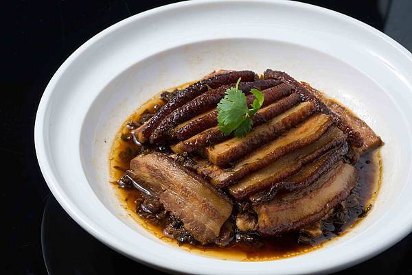 屬於一道新式淮揚菜,將傳統的老常州酒糟扣肉和粵式香芋扣肉的全新融合,帶來了全新的味蕾體驗和視覺感受。相傳該道料理緣起於廚師的新鮮嘗試,意外拾獲美味,故「創新」便是此道料理的響亮名號;其從粵菜香芋扣肉中獲得靈感,選取芋頭來吸收五花肉的油和肉味,一紅燉、二扣碗、三上籠的烹飪步驟,充分吸出扣肉油脂,使肥而不膩、入口即化、甘香可口,而香芋則為此次丁主廚特別選用的大甲芋頭,粉糯香軟,不失為一次驚喜結合在地食材之作。