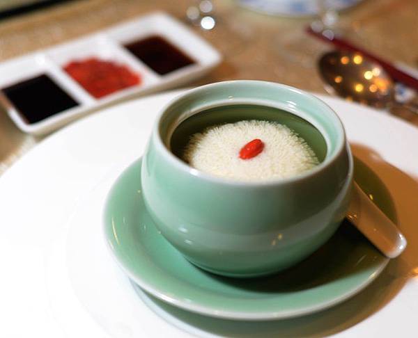 翡翠菊花豆腐是淮揚美食與藝術共融的完美詮釋,同為考驗廚師刀工及刀感的一道佳餚。選用玉脂豆腐、素高湯等烹製而成;用快刀將質地柔軟細嫩的豆腐從上截面紛紛切下,並保證下截面紋絲不動,最終形成藕斷絲連、連綿不斷又根根均勻的形態,放入水中,輕輕撩撥,細能穿針的“菊花豆腐”在清水碗中綻放,仿佛絲縷菊花隨風搖曳,栩栩如生,如夢似幻。