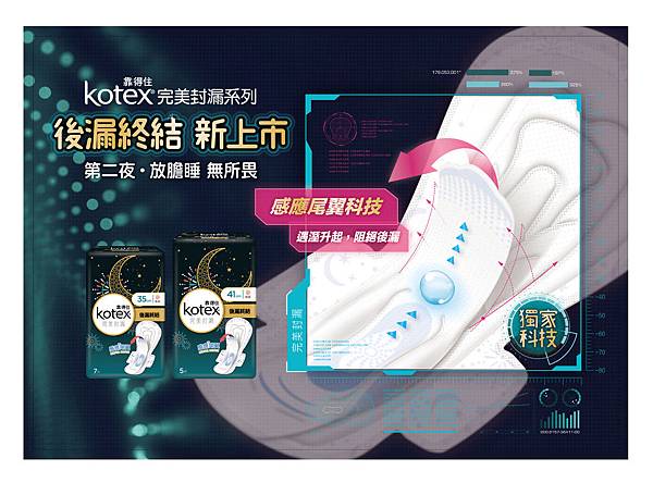 全新上市的Kotex靠得住完美封漏系列後漏終結夜用衛生棉,充滿科技感的獨家感應尾翼創新設計前所未見,在產品上市前的大型消費者測試活動中,獲得高達9成以上的使用者滿意度!消費者對於遇經血會自動升起貼合股溝的智慧感應尾翼感到新奇,使用後對產品可以有效阻擋後漏的成果感到滿意。