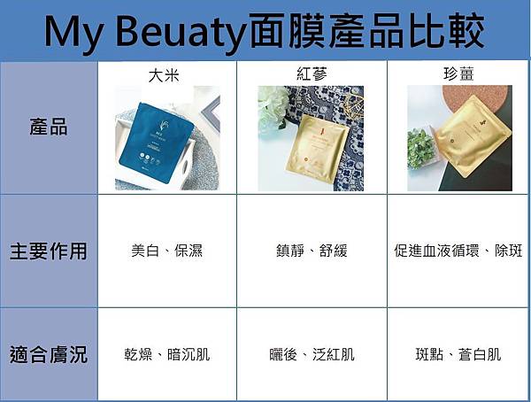 身為韓國品牌,My Beauty面膜主打高級專櫃質感,因此也有貴婦面膜的稱號。而其中最知名的三款面膜分為:「My Beauty美白抗皺大米面膜」、「My Beauty紅蔘黃金水凝面膜」與「My Beauty珍薑黃金水凝面膜」。面膜本身除了成分珍貴之外,最主要的就是不同於其他品牌,擁有優越的親膚服貼感,就連運動時邊敷也不會有滑落的問題,且面膜主打無添加,天然的成分讓你用了也安心!