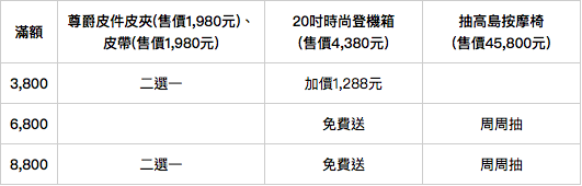 消費滿額送尊爵皮件、時尚登機箱 周周再抽高島按摩椅