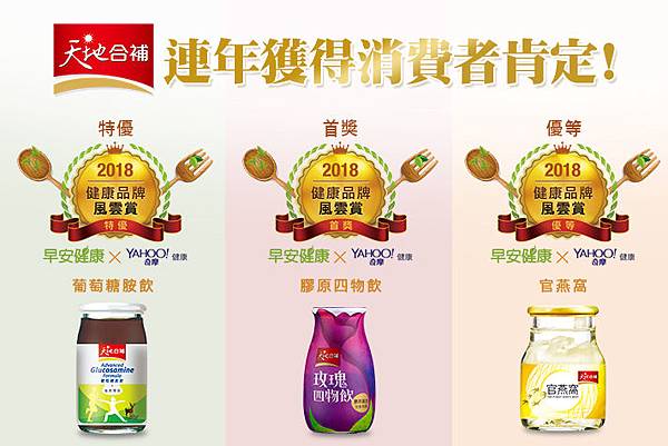 本次Yahoo健康品牌風雲賞,佳格食品在營養補充品類贏得優異的口碑,包含桂格養氣人蔘、桂格活靈芝、桂格雞精、桂格滴雞精,以及天地合補玫瑰四物飲、天地合補葡萄糖胺飲、天地合補官燕窩。在醫療保健類中,又以桂格完膳糖尿病配方、腫瘤配方、透析配方,獲得特殊疾病營養補給品的肯定。日常飲品類 (豆漿、豆奶、米漿) ,桂格喝的燕麥也廣受年輕健身族群的喜愛而獲獎。