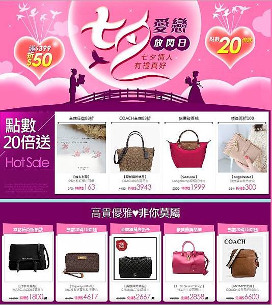 01. momo摩天商城為歡慶七夕情人節,將於8/1~8/17推出《七夕愛戀放閃日》活動,匯集全球各大精品品牌商品供網友選購,並回饋20倍點數以及抵用金現折。