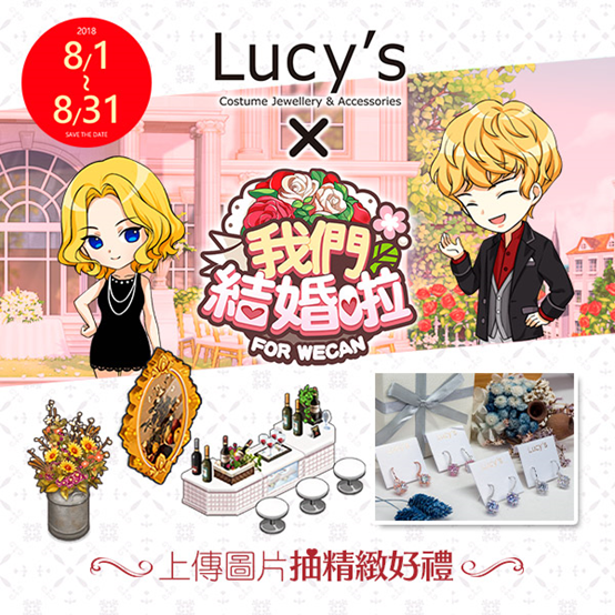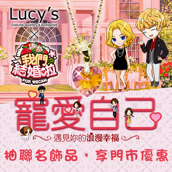 即日起至8/31日,至門市出示《我們結婚啦》人物達10級的遊戲畫面,即可享限量價$149元(原價$880)之浪漫優惠,加購購買《Lucy's》x 《我們結婚啦》聯名獨家實體項鍊。