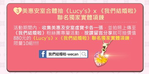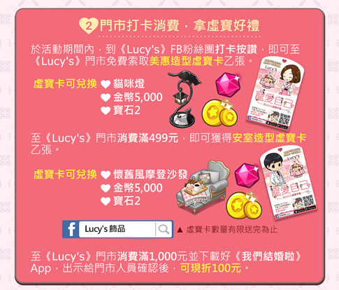 浪漫三:至《Lucy's》門市消費滿1,000元並下載《我們結婚啦》遊戲App,出示給門市人員確認後,可現折100元。