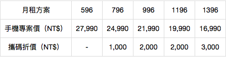 如搭配1396方案,手機只要NT$ 16,990,攜碼再折價NT$ 3,000