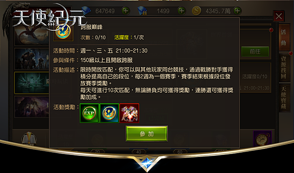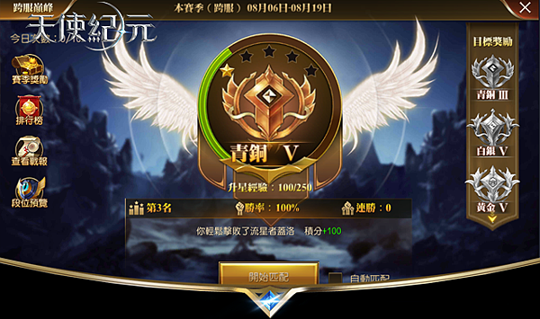 巔峰對決為《天使紀元》中一個跨服天梯PVP的特殊玩法。您將和其他來自世界服中不同伺服器的玩家一對一比拼切磋,同台競技。通過戰勝對手獲得積分,提高自己的段位。每兩周為一個賽季,賽季結束後根據段位元發放賽季獎勵。