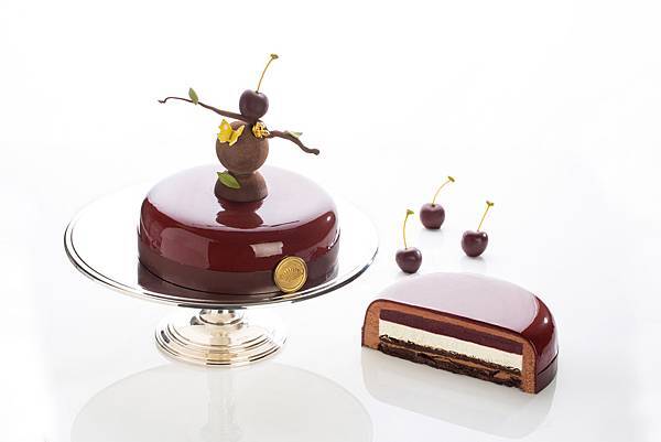 摩登時尚的外型其內填入香醇苦甜的巧克力海綿蛋糕、杏仁慕斯及櫻桃庫利,其上的櫻桃造型巧克力則是注入香氣迷人的櫻桃白蘭地和巧克力慕斯,一口咬下,酒香四溢,與濕潤不甜膩的櫻桃巧克力蛋糕完美演出,經典雋永的成熟風味,魅力獨具!