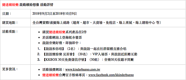 於 2018 年 9 月 2 日至 2018 年 10 月 9 日期間,凡在全台通路購買健達繽紛樂產品任2件,於活動網站上登錄發票號碼,即可參加抽獎,多項鼓鼓音樂好禮即抽即中,購買越多中獎機會越高喔(www.kinderbueno.com.tw)參加活動的粉絲們,將有 2 名幸運兒可獲得首獎 - 【鼓鼓和你唱】,與鼓鼓一起線上直播,合唱健達繽紛樂全新品牌歌曲,零距離地與鼓鼓互動,絕對羨煞所有粉絲。另外,亦有20位幸運兒,能成為【鼓鼓繽紛樂見面會】的VIP嘉賓,由鼓鼓親自分享健達繽紛樂品牌歌曲的創作靈感,還能與鼓鼓合照留念,喜歡鼓鼓的粉絲們千萬別錯過!最後,品牌會再抽出 50 組KKBOX 30天免費儲值序號,讓喜愛健達繽紛樂及音樂的你,盡情享受歌曲,收聽不間斷,好禮有機會即抽即中,讓大家快樂一次擁有,一起繽紛樂每一天