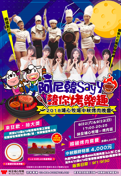 中秋節將近,除了應景地闔家團圓賞月、吃月餅、柚子之外,烤肉也是主要的活動。埔心牧場將於9月22日起展開中秋系列活動,分別於9月22日、23日,共計兩天,在牧場園區舉行「阿尼韓say yo 韓你烤樂趣」活動,一連串的中秋活動包含趣味競賽遊戲、VIP級韓式烤肉盛會、抽大獎。