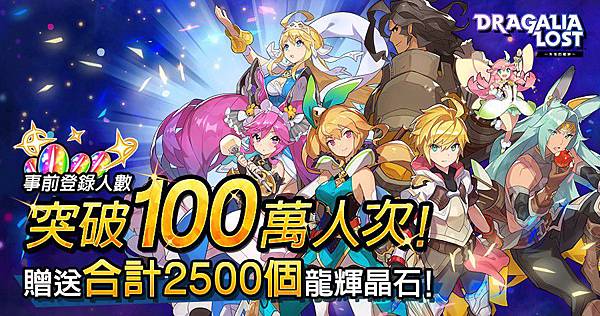 自4月27日(五)起開始舉辦的事前登錄活動已突破100萬人次。為慶祝事前登錄人數突破100萬人,正式營運後除了事前活動特典的 「龍晶輝石1500個」之外,將額外贈送各位玩家「龍輝晶石1000個」。