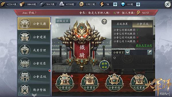 當實力不足,覺得勢單力孤、難以抵抗其他大軍師的入侵時,可速找一個心儀、中意的公會加入。每位大軍師可選擇加入一個喜愛的公會,也可以使自身等級達到VIP時,創建一個專屬公會。