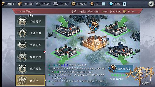 當會長或副會長啟動公會召集令時,旗下的公會成員可立即回應召集令,將自己的主城遷移至召集令發起者的主城附近,實現主城集結,此一行動不僅可向敵手展示實力,更是為往後擴展領地、攻城掠地的行動鋪上一條康莊大道。
