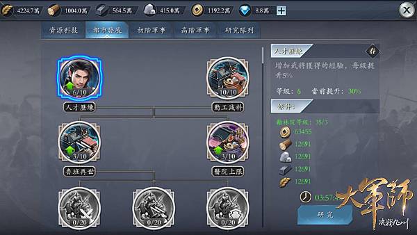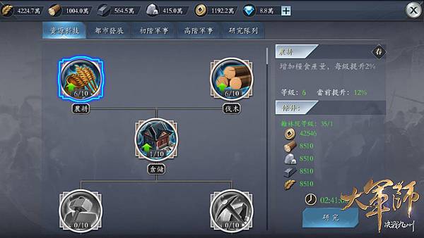 包含農耕、伐木、採石、煉鐵、倉儲與鑄幣等六個資源類的科技,主要提升資源的採集速度和資源的存儲數量。對於喜愛發展農業經濟的大軍師而言,此項科技是不可或缺的。