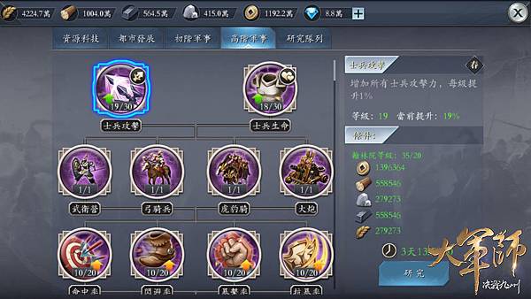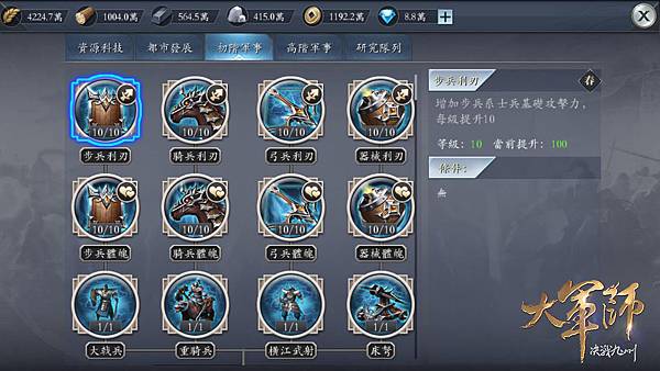 包含步、弓、騎、器械四種兵種的攻擊、血量,以及高級命中、閃避、暴擊與韌性等等一共十二項軍事類型的科技,主要快速提升玩家的軍事實力,對於喜愛先發制人發起戰爭的大軍師而言,可優先發展此一類型的科技。